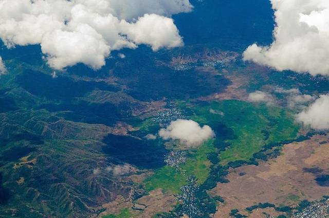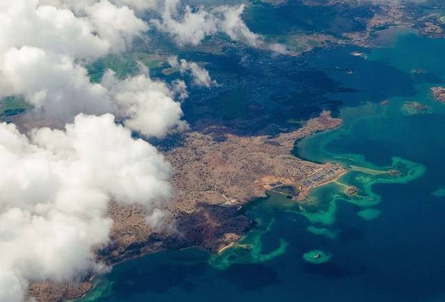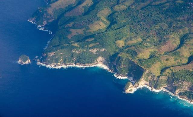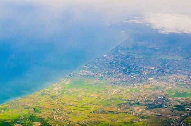 乘坐的小型飞机飞行海拔并不高,所以我们能看到的地面并不只有颜色,还有那蜿蜒的道路,错落排列的城镇乡村,以及那一片蓝色的大海