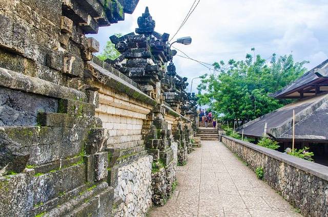 蜿蜒的小径直通寺内,悬崖一侧则用混凝土墙加固。从寺庙的一头走到另一头约需一个小时,沿途有多处由栅栏围起来的区域可供驻足。通往乌鲁瓦图寺内院的带翼一体石门是公元 10 世纪的遗物。带翼石门在岛上并不常见。 Pura Uluwatu 在公元 16 世纪增添了 Pura Dalem Jurit。其内部设有三座雕像,其中之一为梵天。毫无疑问,正是位于印度洋波涛之上 250 英尺高的台地边缘的崖顶环境使得乌鲁瓦图寺壮观无比。乌鲁瓦图寺也是观看断崖海景的绝佳位置。崖底澎湃的海浪冲击着巨岩,海平面上景色非凡,而这片海域巨大的海浪也使其成为各国冲浪好手冒险的冲浪点。