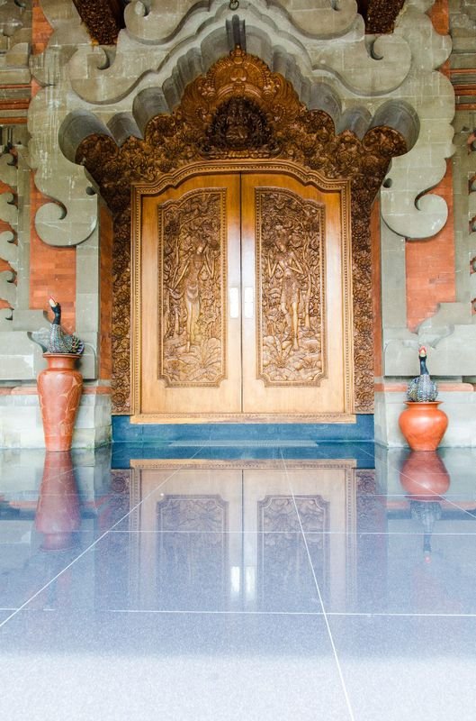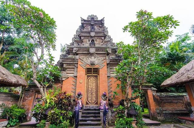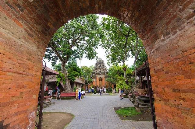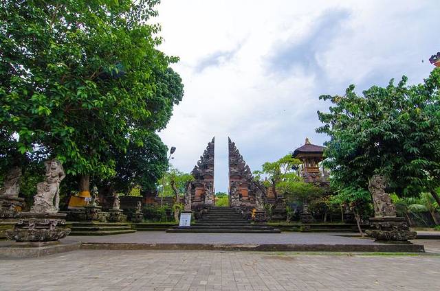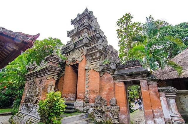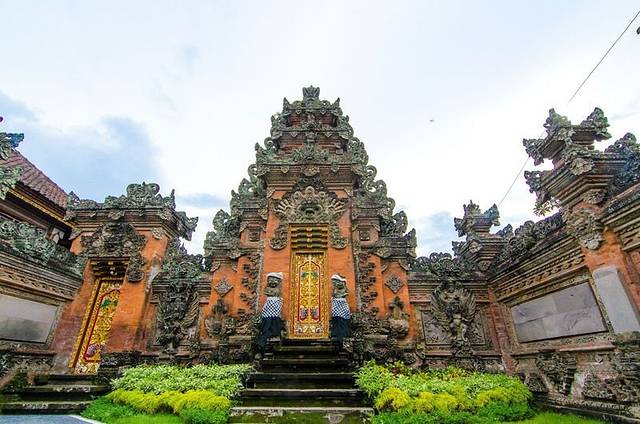 乌布皇宫坐落在素有“巴厘岛艺术重镇”之称的乌布,于16世纪建成,气势恢宏,且石刻技术堪称一绝,手工精致细腻,处处的金箔装饰让整个气氛更显辉煌富贵。宫殿位于市内两条主路Jl. Monkey Forest和Jl. Raya Ubud交叉口处的繁华地带。由于坐落于繁华地带,再加上乌布的道路非常的窄,所以堵车是很严重的,我们一行人坐在车上看着别人走路不断地超我们,于是最后忍无可忍全部下车走到了乌布皇宫。