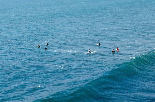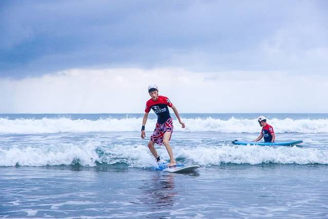 16.冲浪时,当小浪来的时候可以将板垂直对着浪,然后压这板的后面将板头翘起来,这样基本上不会因为板受力被板带回海滩了(许多小伙伴就是因为板的方向不对,一直在海滩边徘徊)