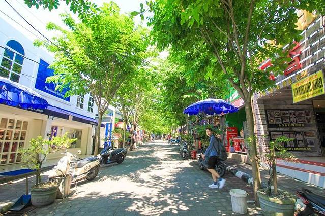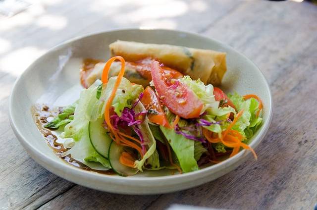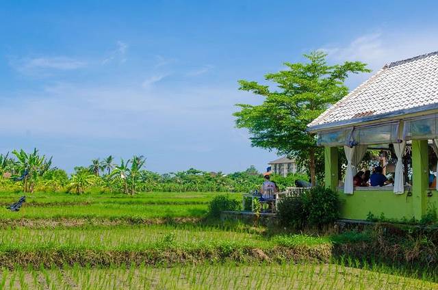 努可餐厅,一间装饰简单的院子,门前两颗硕大的八角梅,红黄相错,煞是好看。沿着曲折狭窄的走廊进入到餐厅,正午时分,餐厅早已坐满了人,顾客大多是金发碧眼的白人。再往里走,沿着农田有序矗立着的几颗树下摆放着三张餐桌,正对着农田坐下,看着秧苗随风摇曳,偶有村民正午的烈日下劳作