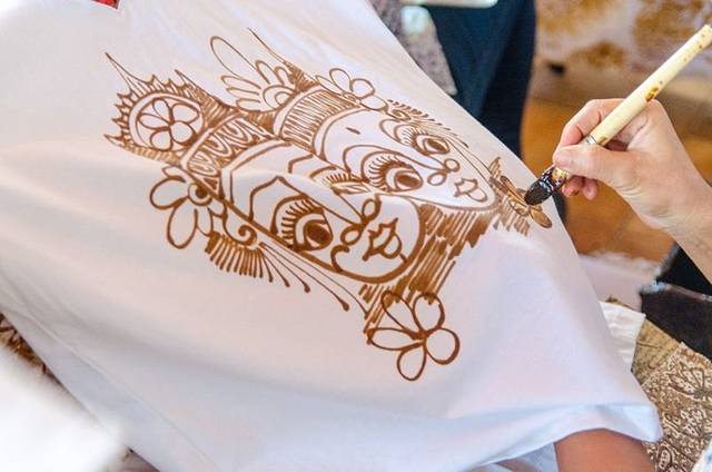 选好图案,然后把衣服递给手艺人,三两分钟后一件简单的蜡染作品就出现了,完成后需要给手工费一万印尼盾。蜡染干起来特别快,一般画完就干了,也就能直接穿起来了,我终于有短袖穿了,哈哈