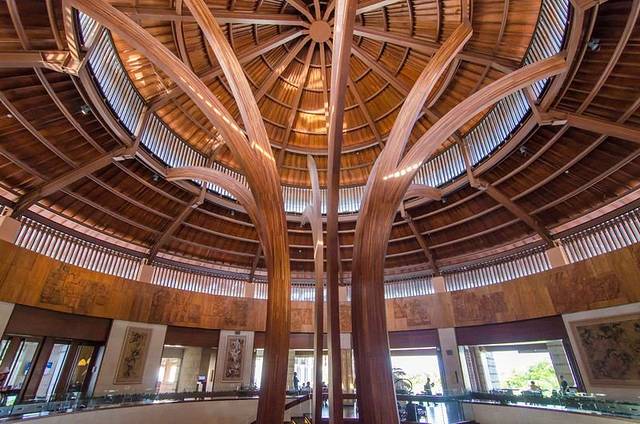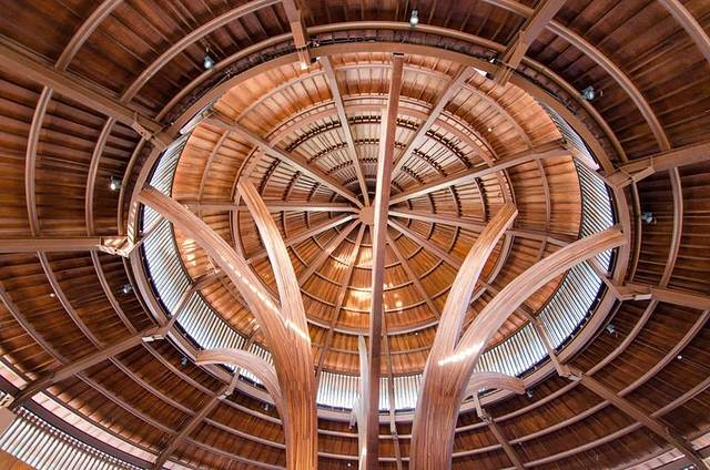 穿过一道宽敞的走廊,来到酒店的正中心,逼格瞬间上升了,木质的穹顶,几株木雕在穹顶之下,整体看上去就像是一棵巨大的树,穹顶旁的墙上镶着木质的雕画。