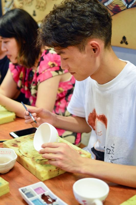 参观完工厂,轮到我们自己画陶瓷,感谢同行小伙伴帮我记录下认真创作时的样子。身上的那件T恤就是前不久参加一次活动中自己即兴发挥的抽象派旷世巨作,好多小伙伴想要可惜我实在没衣服穿就穿上了。