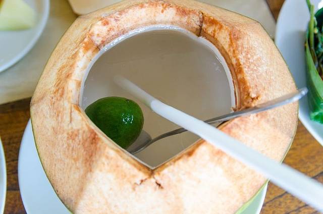 餐后每个人上了一个大椰子,里面加了青柠,还配了一个勺子,可以用挖椰肉吃,不过后来椰肉全被我们喂鱼了。这里的鱼实在是凶残,手伸下去都直接咬,好在不是食人鱼。后来发现鱼非常喜欢椰肉,于是我的一个椰子,被他们拿去喂鱼了