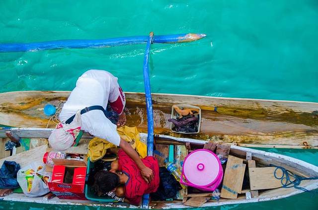 即将到达粉红沙滩,二愣子已经把持不住了。大船只能停靠在距离沙滩一百多米的地方,然后通过小船将小伙伴送到沙滩上。船刚挺好,就有两条当地的猪槽船靠了上来,原来是一位父亲带着两个小孩售卖纪念品,零食,饮料·····我看了下,船上的工作人员示意我不要买。