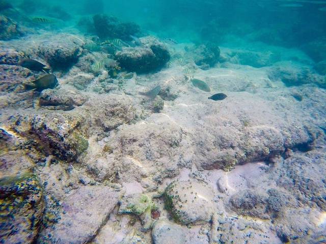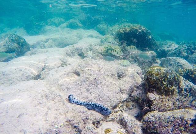 在粉红沙滩浮潜最好穿上脚蹼,身上最好穿上潜水衣,因为礁石很多,很容易划伤的,小伙伴基本上都负伤了,我也是。粉红沙滩的海水还是比较清澈的,第一次浮潜,经验不足,看到海里五彩斑斓的鱼,立马跟了下去,然后被灌了一嘴的海水,再加上海底很滑,也容易划伤,所以根本不能站着。