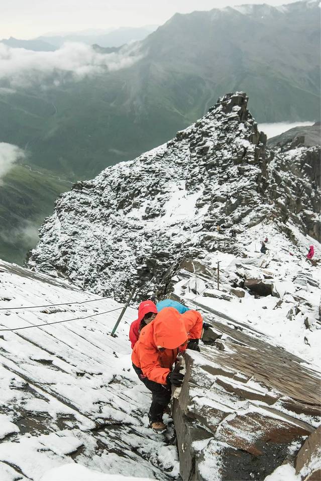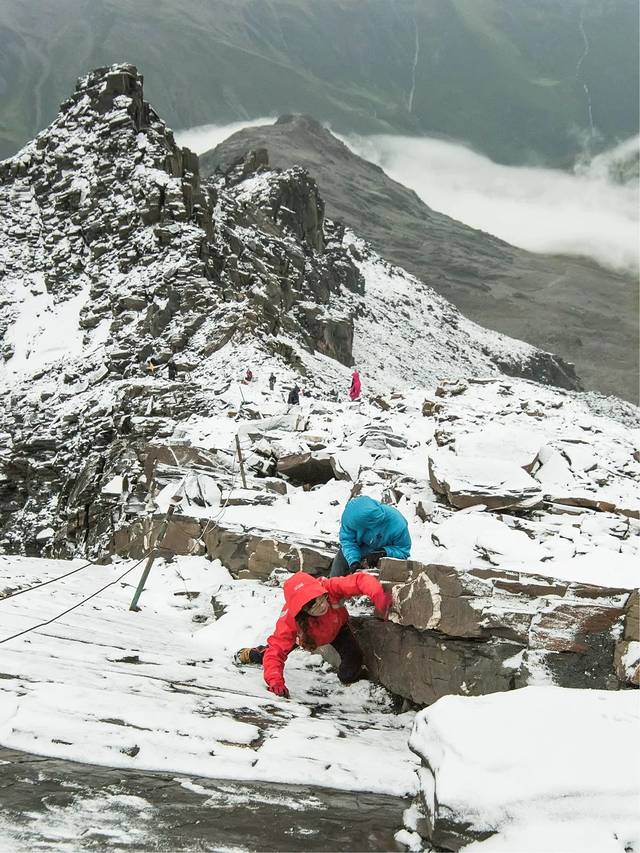 爬着爬着,天空飞起了大雪,在这样的环境,很多时候我们是手脚并用的。
