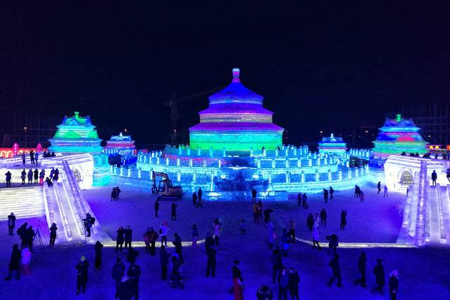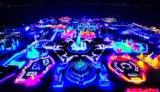 空中俯看冰雪大世界全景,冰的海洋光的世界。第18届冰雪大世界占地面积80万平方米,共划分为5大功能区:欢乐城堡区、欢乐体验区、欢乐互动区、欢乐演艺区、欢乐服务区,总用冰量18万立方米,总用雪量15万立方米。