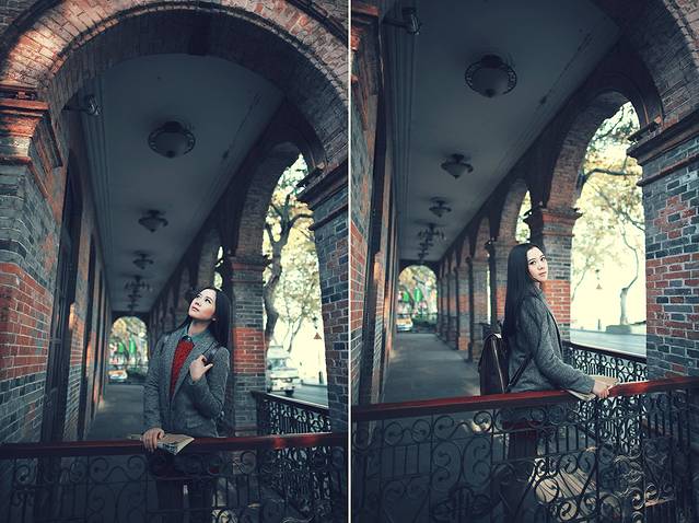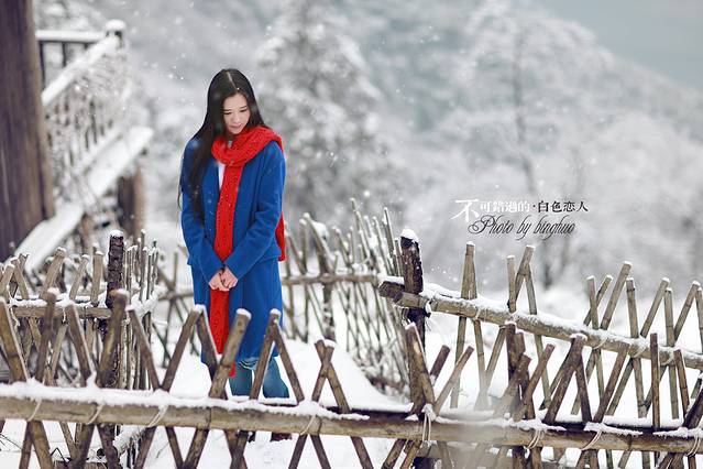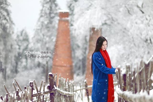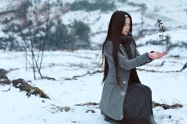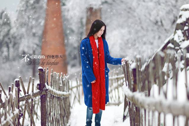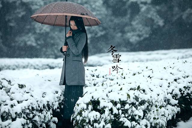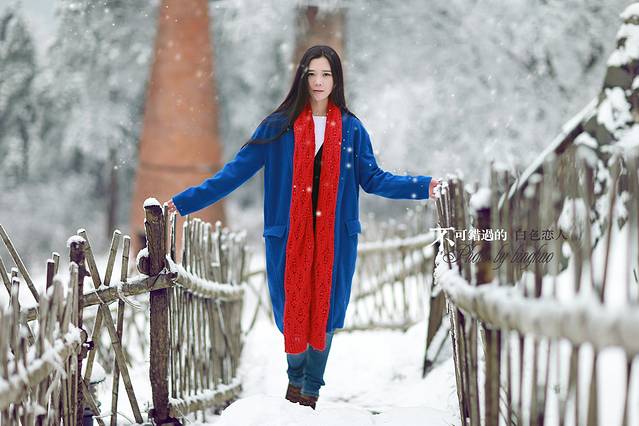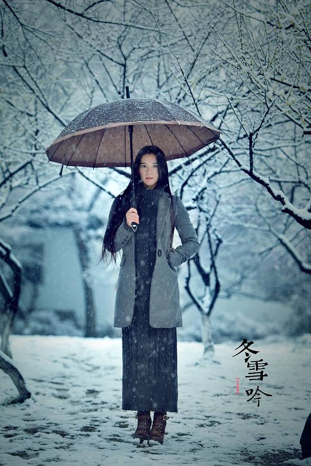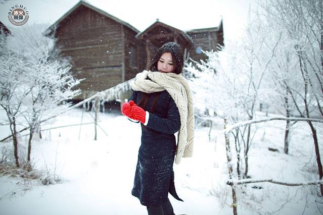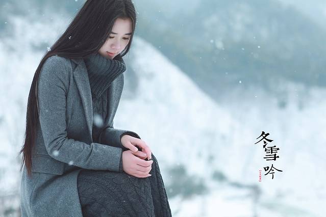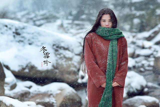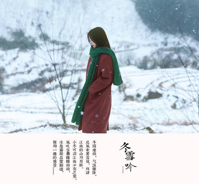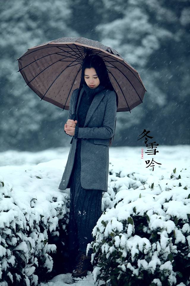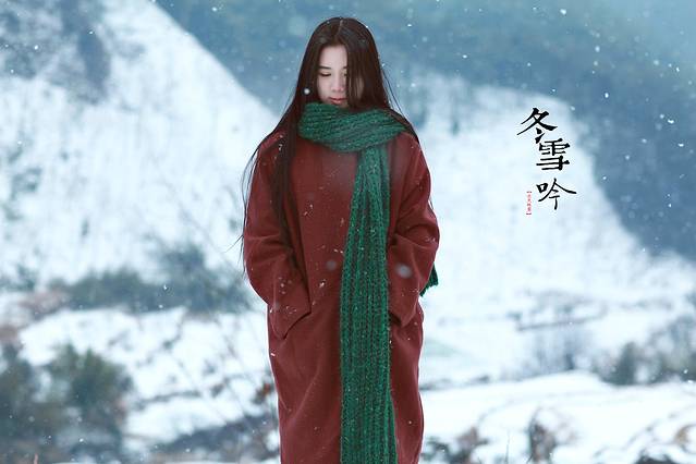 其实雪景人像也不一定非要穿亮色的衣服才出效果,雪中拍摄你也可以尝试冷色调的搭配哦,砖红,黑色,灰色都是不错的选择,江南雪景也可以拍出韩味来。