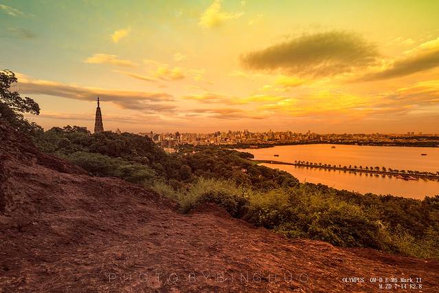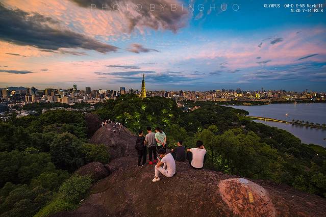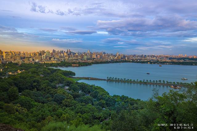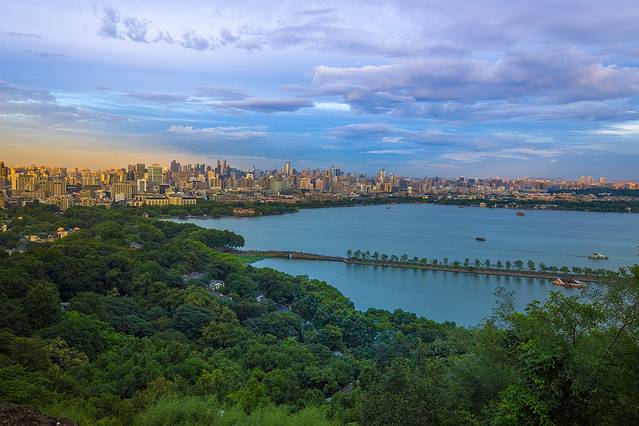 夕阳下眺望远处的西湖美景,波光粼粼,更是让人沉醉,静坐山顶真想时光停滞,留着这一切美好