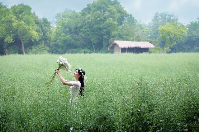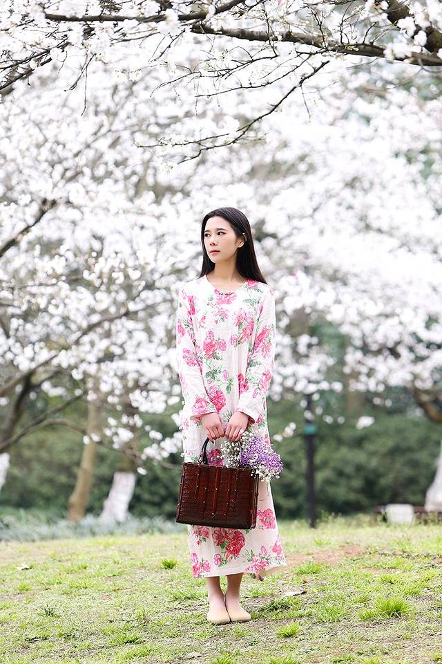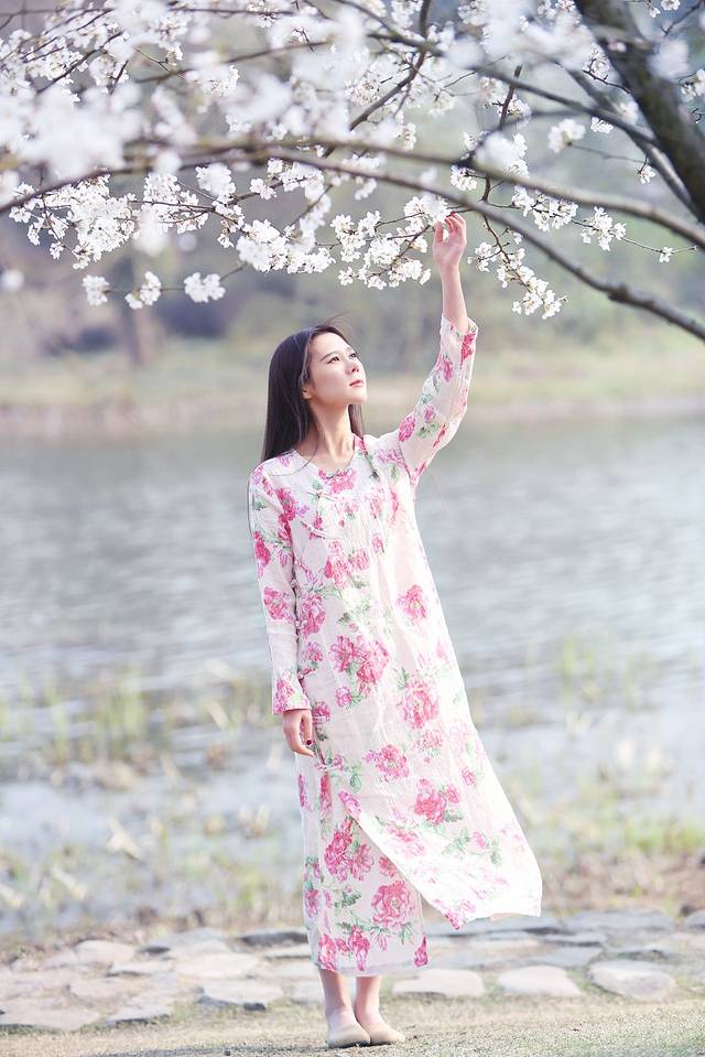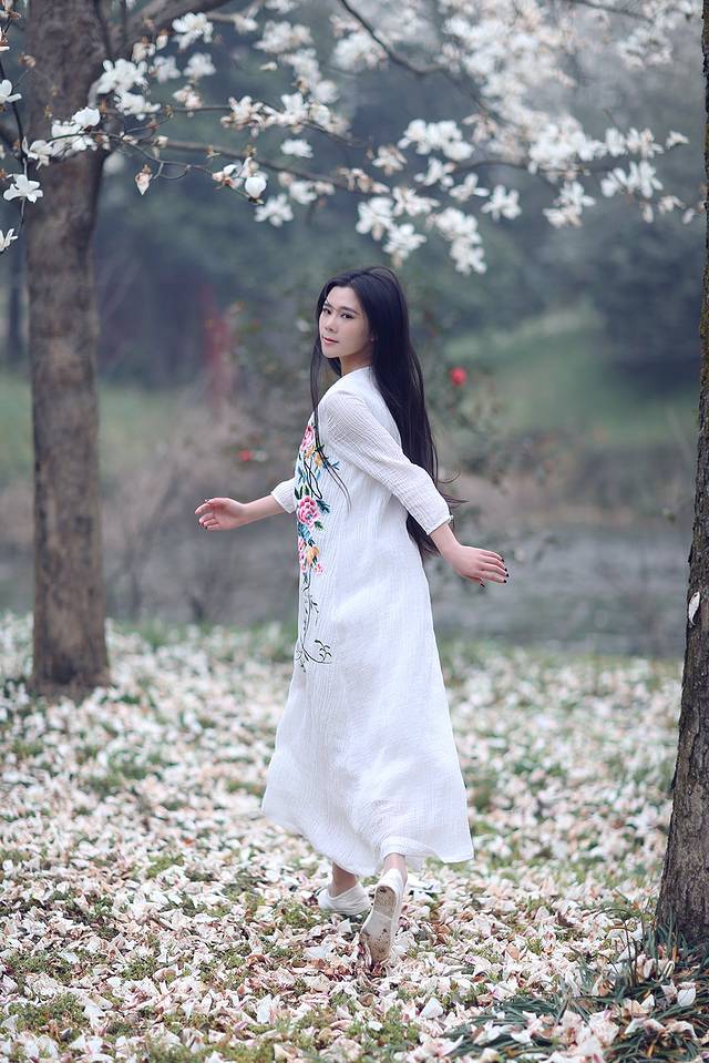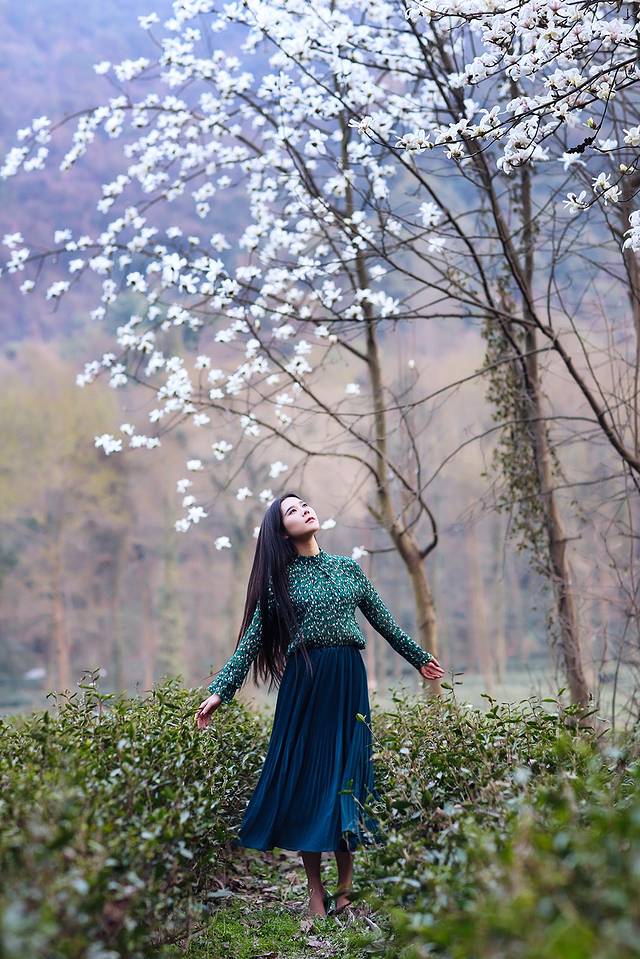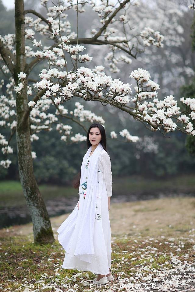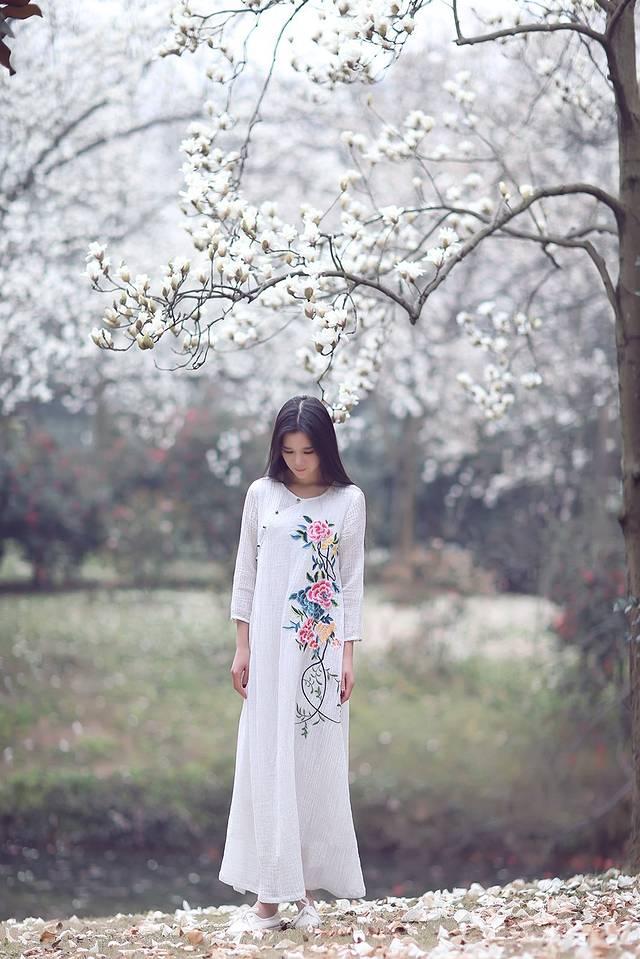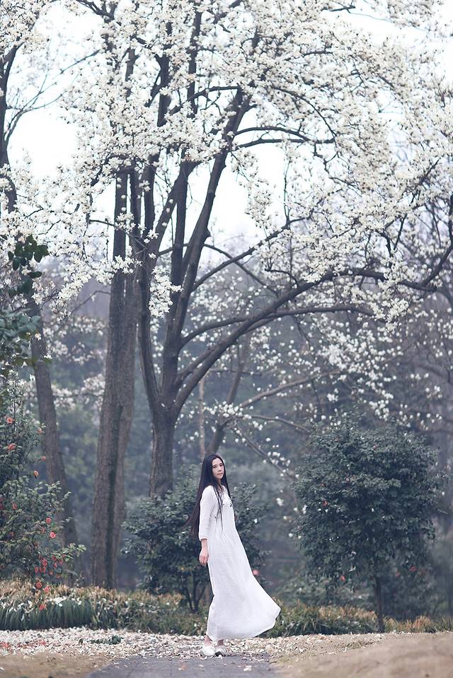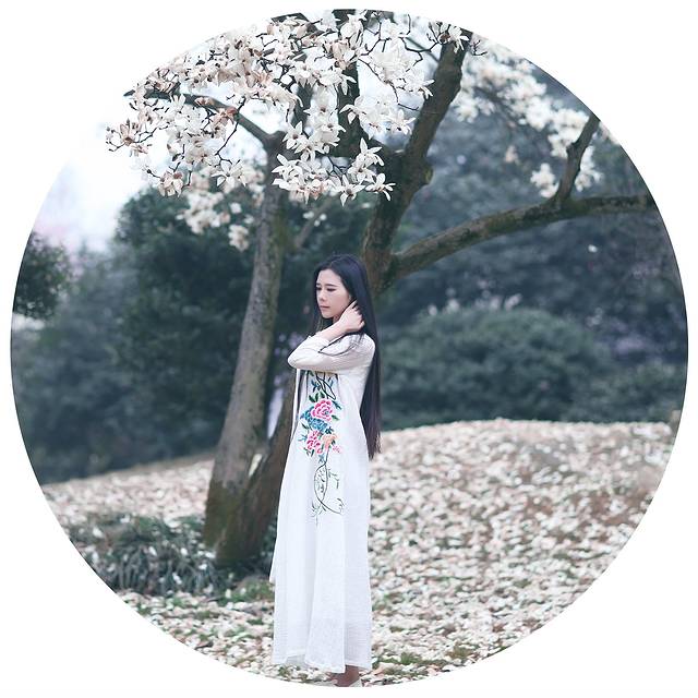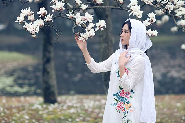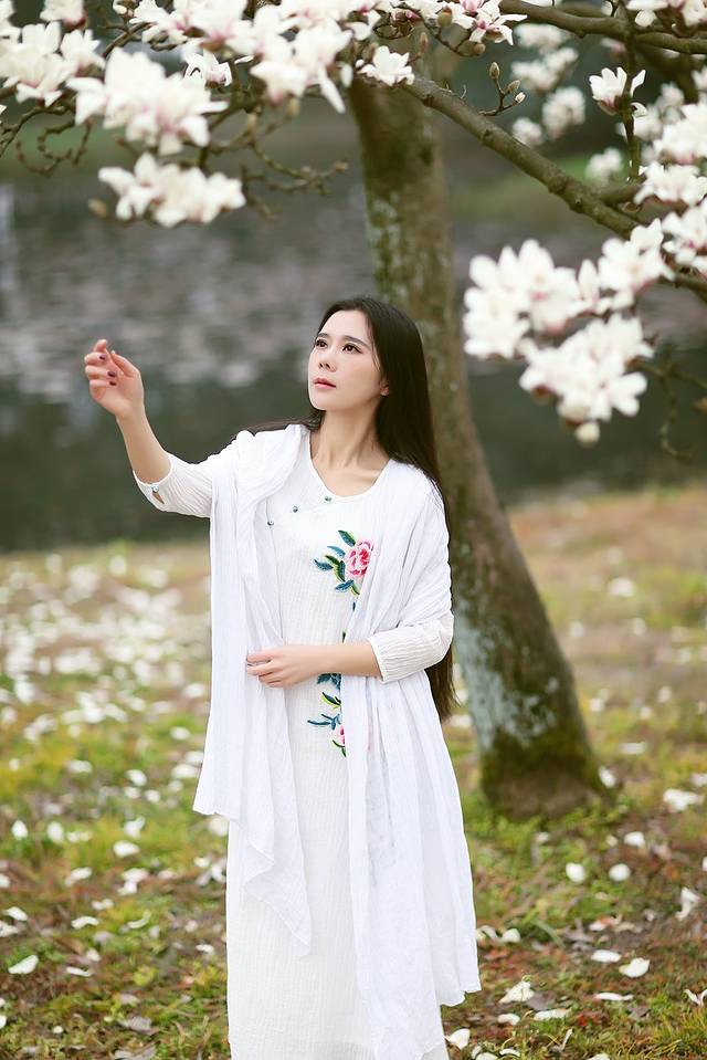 玉兰和中国风似乎有着千丝万缕的关系,一席白色国风绣花裙配上玉兰让你瞬间变女神,整个画面散发浓浓的古典风,尽显江南女子韵味。