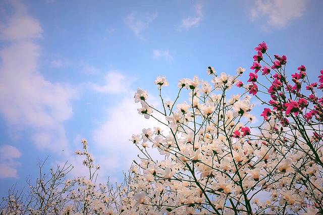 白的,粉色,紫的,在蓝天白云映衬下,温暖了整个春天