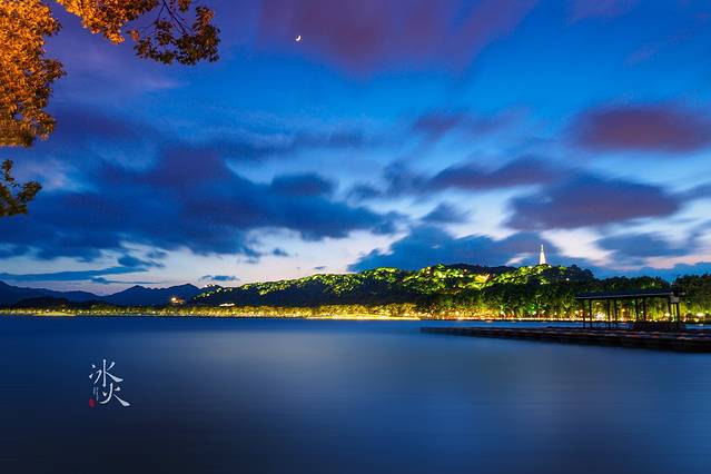 漫步西湖,沐浴晚风,新月当空,远山戴影,湖面如镜,灯火阑珊,天堂掠影