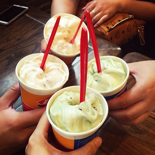 四个人去吃DQ 休息一下 不得不说 这真是一个吃货组合 逛景点只为消食的四人完美组合~