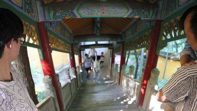 亭台楼榭,一段段廊道,树荫下也别有一番清凉。我们开始兴头很足,爬到前面在等待后面的群众。下面的台阶还不算太陡。