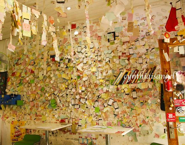 由于走了一上午,也是接到朋友快要到的电话,就找了一家店坐了坐。属于小清新的甜品店,满墙都是客人留下的便签纸。