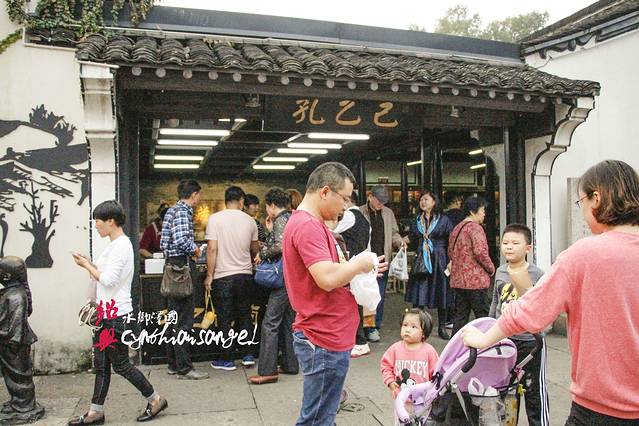 从故居出来,对面就是一个大大的墨池。斜对面是一条街,有一家老街饼店,门口挂着王羲之与“躲婆饼的传说”。再往前走,就是越酿工坊,里面包含了黄酒的制作过程。