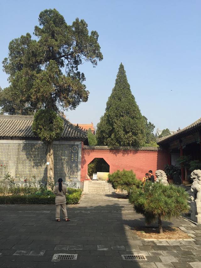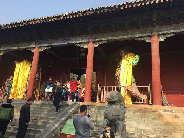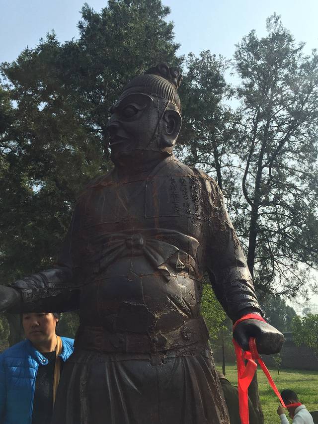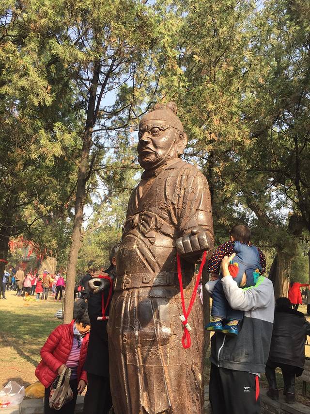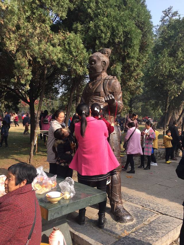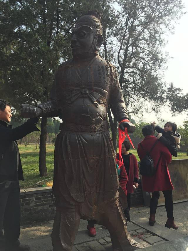 中岳庙崇圣门东侧有4尊铁人,宋代治平元年铸造。它是我国现存形体最大、保存最好的四个“守库铁人”,人们都称他们为“镇庙铁人”。传说金兵南侵,铁人准备渡河抗金壮志未酬,当地的百姓对铁人充满了崇敬之情,把它们奉为守护神,孩子周岁时,要到中岳庙的铁人前举行挂锁仪式,把铜锁或银锁先挂在铁人的臂膀上,然后让孩子焚香叩头。然后将锁从铁人身上取下,挂到孩子的脖子上时,就意味着锁是铁人送给孩子的礼物,孩子受到铁人换保护,以后就会平安健康。这种习俗,有人称为“挂锁”,有人称为“拜干爹”。太原晋祠也有四尊铁人,但大小只有中岳庙铁人的三分之一,差远了。这个铁人姓刘,也是我的干爹,老帅了