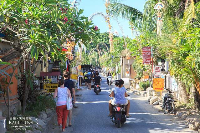 沙滩上只有一条窄窄的道路根本没地方停车,所以跟着小黑兜兜转转绕往后面的小路。一直听说巴厘岛的路特别窄,骏爷总算是认识到了。