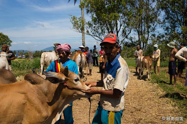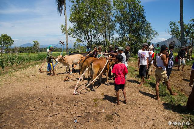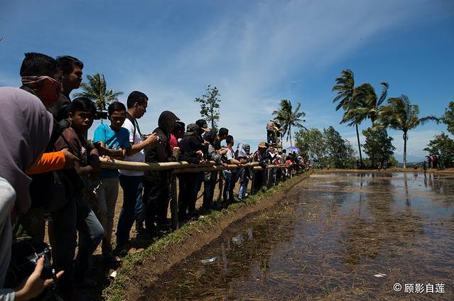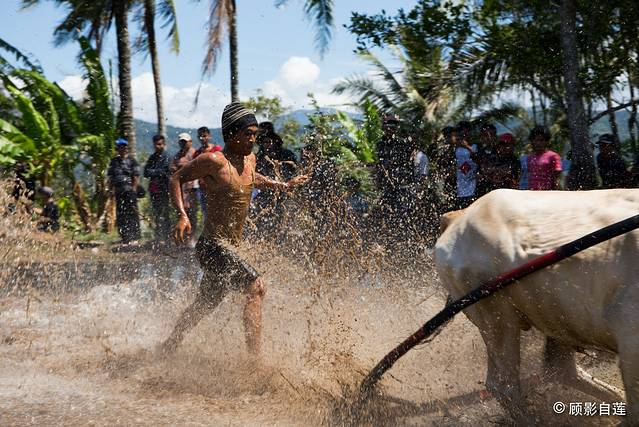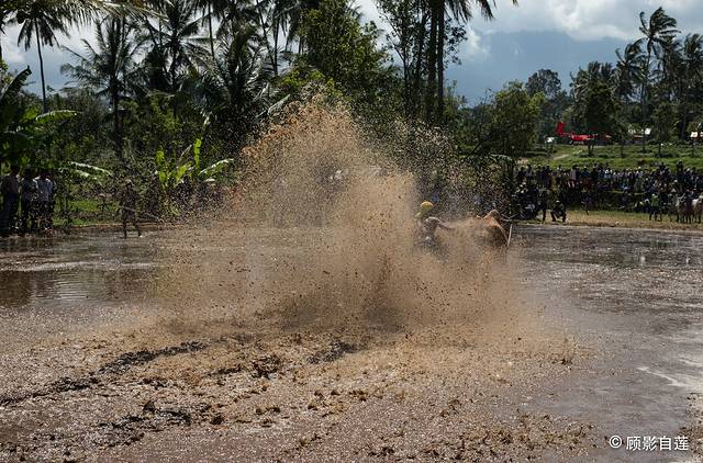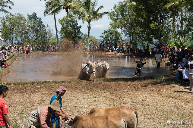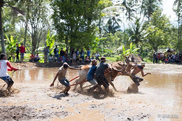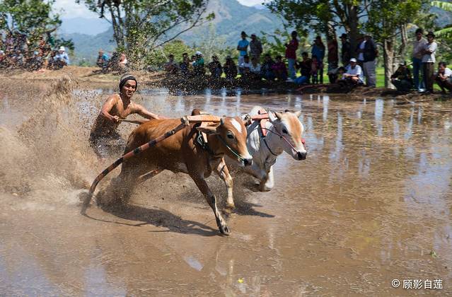 印尼赛牛的方法很特别。当地人会给两头牛套上一个赛牛杆,然后自己踩在杆的底部,抓住两只牛的尾巴向前冲过一大片带水的泥巴地,有一点牛车的意思。速度越快、溅起的水花越大、泥巴越多,就说明这牛越健康越有力量。一般西方媒体对此的评价都是危险和野蛮。想说危险那是相当的,不仅是针对驾驶者。亲眼见到好几个被牛踢到踩到的驾驶者。感觉一脚下去,怎么样也要断两根肋骨。