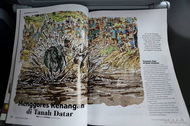 一开始找这个赛牛的场地就费了老大的劲。各大网站都并没有明确的场地名称的资料。凭着Pacu Jawi和往年比赛的照片,我们的司机帮我们一路问人,在开错路了三次以后才终于找到地方。即使是现在我也说不出场地名称,只能告诉大家是在靠近一个叫做Batusangkar小镇的地方。附近最近的机场是印尼苏门答腊岛的省会巴东(Padang),两地车程大约在两个多小时。当时飞机上的杂志正好就有一篇文章是介绍这场赛牛盛会的。可惜我一点印尼语都不懂。不过也不妨碍我夸奖一下插图画的挺美的。
