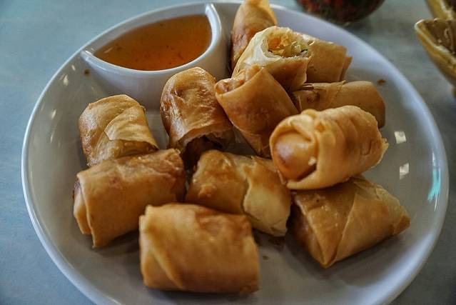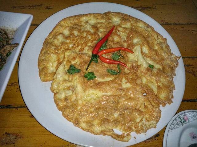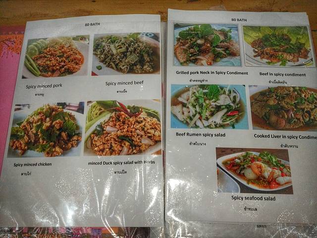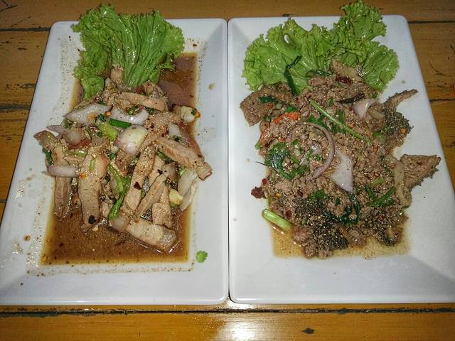 几桌客人全是泰国人,黑瘦严肃的泰国阿姨递来份一看就很地道的菜单(竟然还有英文...)上菜前先给你上一桶冰块和树枝一样的香叶,果然不一样啊!点了一种熟牛肉拌各种香叶的菜,猪颈肉拌各种香叶的菜,还有鸡蛋饼裹猪肉碎炸得胖大,在严肃阿姨确认“spicy,ok?”后,端上来。
