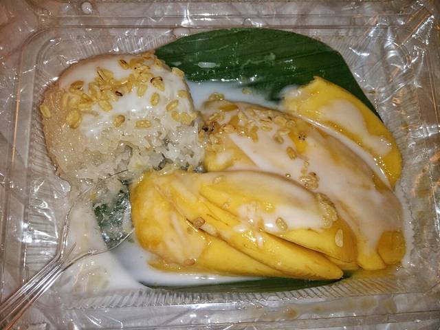 在糯米饭和芒果上淋上炼乳和一些香脆的炒米,甜蜜香软得不行~不过分量比较大,真的很容易腻~