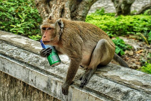 和表情严肃的工作人员买了票,一直走着上坡路,没多久就看到热情的卖饮料阿姨在打招呼,于是买了瓶矿泉水+一听雪碧。接着还没喝两口,就被猴子来了个下马威,抢掉了手里的雪碧..回去整理照片的时候才发现作案猴是只独眼老猴了,大概是因为素行不良所以被其他猴子揍过吧...