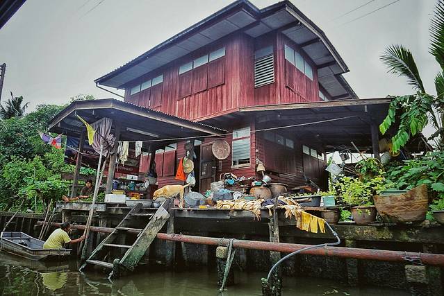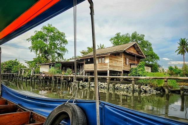 细长的木船行驶在宽阔的Chao phraya river,继而再转入各个狭小的河道,两岸傍水的小屋大多破败,还有居民生活,让人联想【曼谷杀手】里的场景..