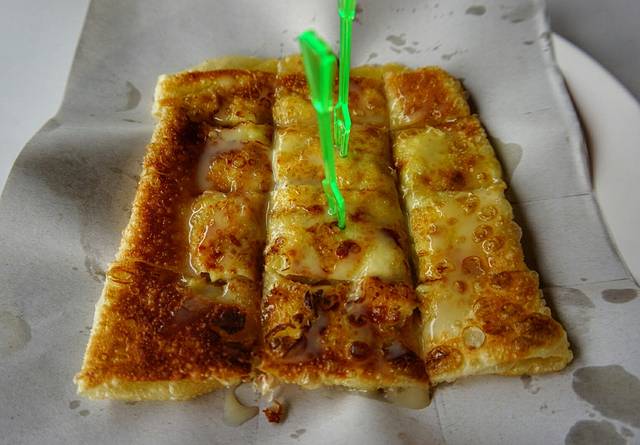 鸡蛋薄饼中夹着新鲜香蕉肉,表面可以淋炼乳,巧克力酱或再撒一层砂糖~我最喜欢的就是只淋炼乳拉~表皮香脆,里面的香蕉心绵软,很好吃~