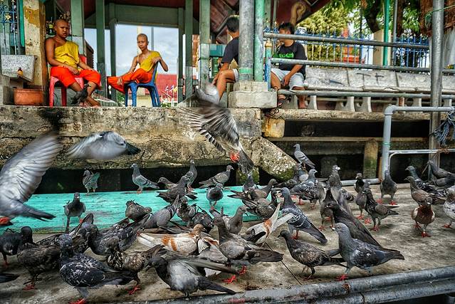 额外的费用就是,船夫让一个滑木舟的卖货大爷向我贩卖了一袋山竹,再给他买了瓶啤酒~停靠在一个坐着两个小沙弥的寺院后门,20b卖给我一个大吐司,用来寺庙门口硕大密集的鲤鱼,和扑棱翅膀的鸽子。