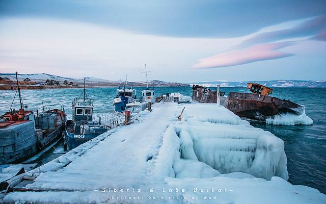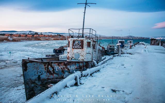 今天是南线一日游,之前趁天没亮,到胡日尔村子里走走,村子一直往南走,是一个废弃的码头,报废的游船被封印在厚厚的冰里。