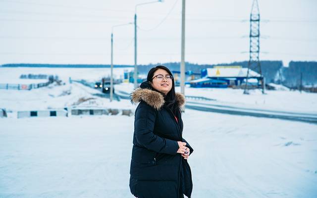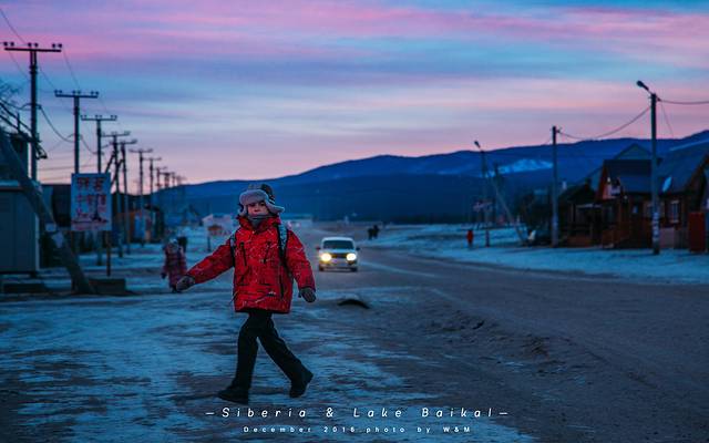 西伯利亚的日出和日落是最美的。这时是早上8:50,太阳还没完全出来,校车就已经开始在岛上各处接孩子们上学了。