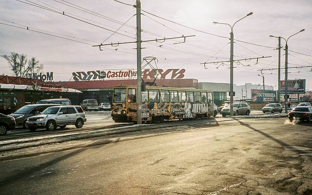中午在中心市场吃完午饭之后,下午去城郊的喀山教堂,乘坐4路有轨电车往长途汽车站东北方向走两站,下车即可。庞大的喀山教堂像是个主题公园式的精致工艺品,有橙红色的墙壁、荧光绿色的穹顶,穹顶上还装饰着金色的小十字架。