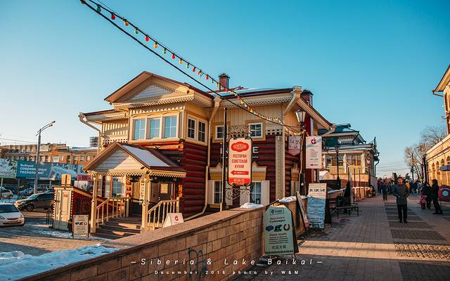 伊尔库茨克最繁华的步行街“130街区”,从机场出来一进城区就是,看来是专门为游客量身打造的。餐饮、酒吧、住宿一条龙,全是很有特色的独栋小木屋,每晚住宿大概500人民币,含早餐。
