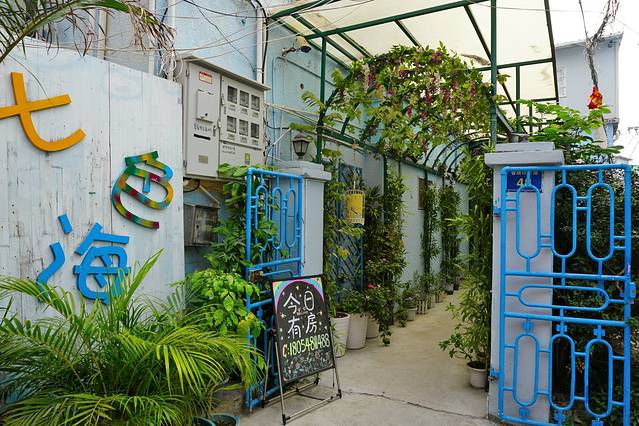 这是一家客栈,叫做七色海,第一眼看过去,觉得挺漂亮,漂亮在哪里呢?客栈的名字,用了艺术的立体字贴在墙上,加了一对,蓝色的铁门,这个铁门的图案,可是点睛之笔,平淡无奇的走廊,加上一段钢铁做的拱门道,最重要的是上面爬满了爬山虎,所以看起来,已经不再是普通的民房了,文艺的气息由此散发开来。