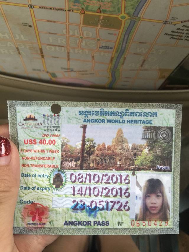 同行的朋友是摄影爱好者,当然日出是我们必看的。为了看日出我们和司机约了早上4点30分来酒店接,早餐可以叫酒店打包。今天还有一位之前在微博上联系的美女和我们一起拼外圈,她很准时的就到了,可是我们的司机左等右等就是不来,打了好几遍电话催了好多次,都说马上就到但是是一副不在乎的样子马上联系了某宝的掌柜,掌柜态度很好,说等看完日出回来帮我解决事情。5点钟司机终于到了(我们等了他半小时)一路上他还是很不在乎的说反正雨季也看不到日出,说好的wifi也没有带天确实也不大好,有点开始下雨了,我们票还没有买,要先去买票。吴哥窟的门票有两种,一种是一天的20刀,一种是三天的40刀(七天之内任意三天)必须本人去买,因为要现场拍照~