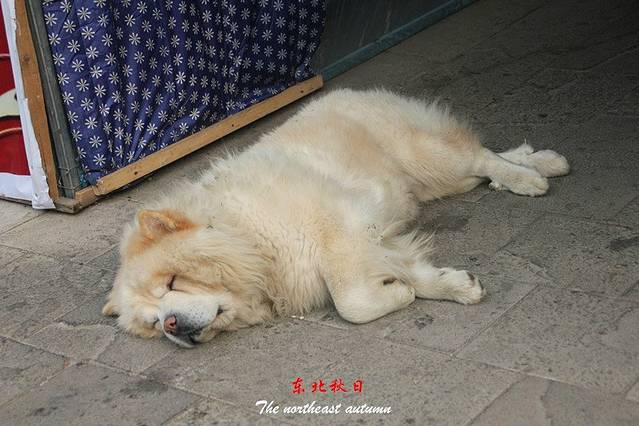 看着松狮睡的,旁边卖烤羊肉的,它到是一点都没受影响。