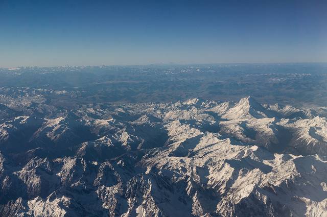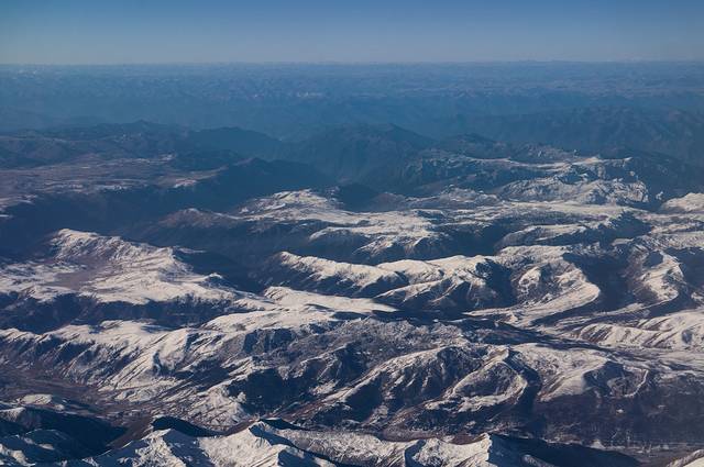 贡嘎过后,就是广袤的川西高原,途径昌都,之后转向西飞,快到林芝时,左手边出现了大片大片的雪山群,南迦巴瓦就在远处的天边。