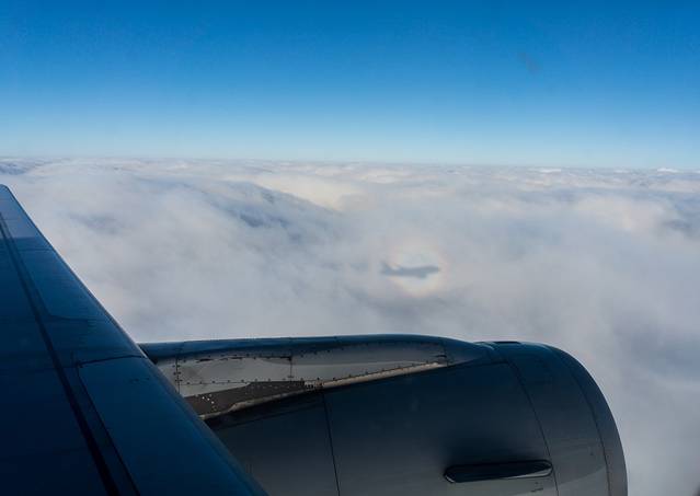 能见度完全为0,只知道我们在不断上升,直到机翼被什么突然照亮了一下。之后对面的云雾开始慢慢散开,然后发现我们的影子映在对面的云上,周围还有一圈五彩的光环,果然是攒人品的结果,遇上了佛光。