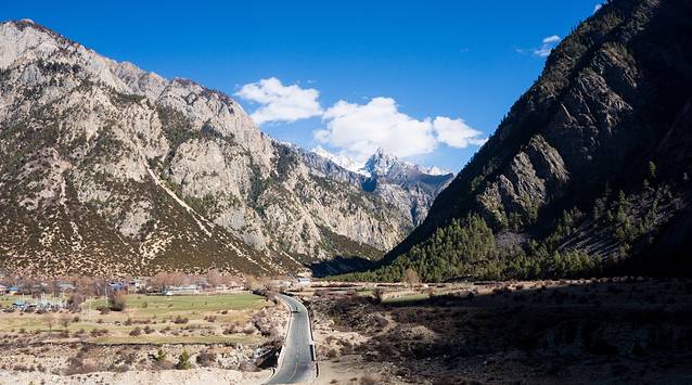 从八宿出发,班车花了大约2小时跨过业拉山,怒江在脚下越来越小,翻过垭口后海拔一路下降,不多时就是邦达镇。
