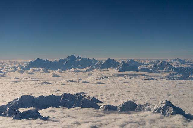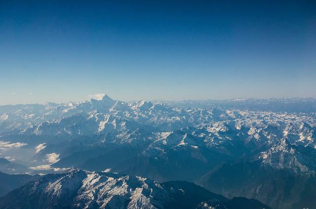 开启上帝视角,从飞机上俯瞰贡嘎山系和南迦巴瓦山系。图中最高峰即为贡嘎雪山。