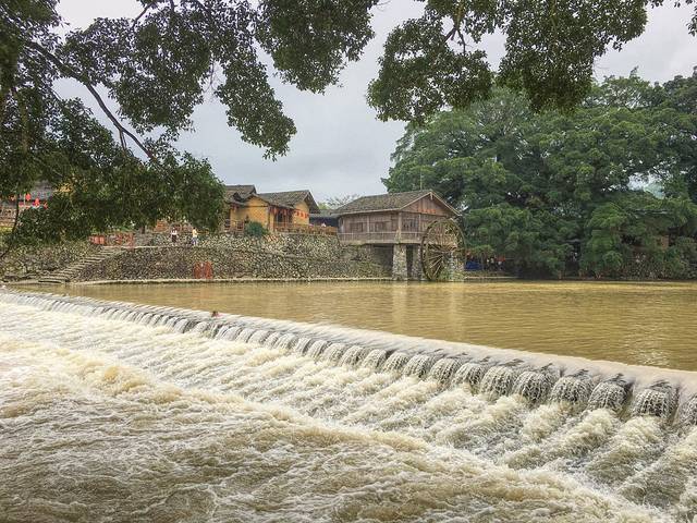 云水谣全景。云水谣是从和贵楼去往怀远楼时中间路过的一个小镇,原名长教村,因为同名电影《云水谣》上映之后,为了借助电影宣传而将村子的名称改成云水谣。镇子本身不大,取景的就是河边水车那一部分,广场上有关于云水谣这部电影的拍摄介绍。当初之所以想来这里游玩,主要也是因为受到了电影的影响,一直想到这座陈秋水当年生活过的村子来看看。