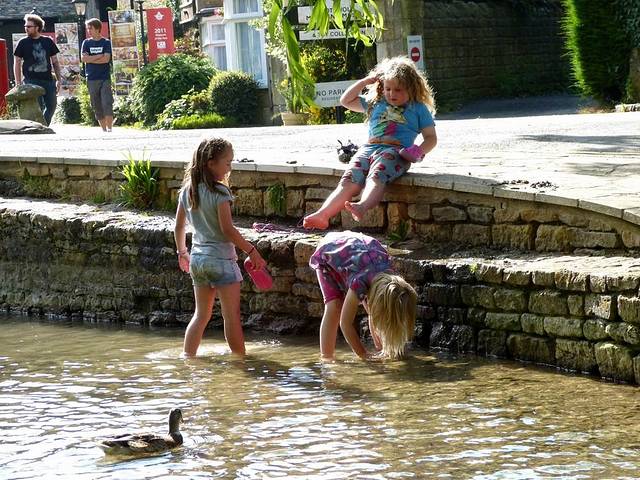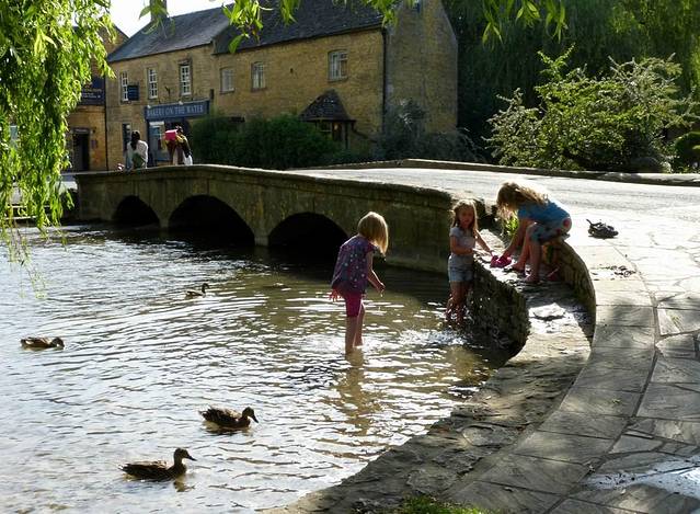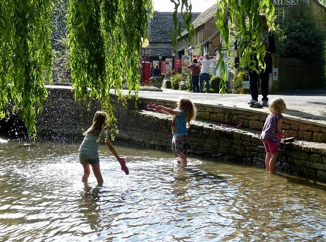 清澈见底的小河由西向东贯穿整个村庄,最终汇入泰晤士河,河上有五座超过几百年历史的石桥连接,河水很浅,有许多孩子在岸边或水中玩耍戏水。