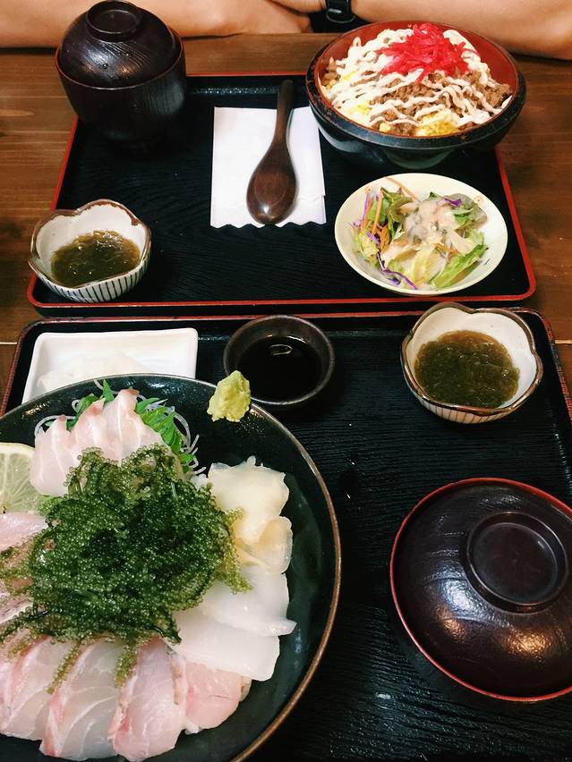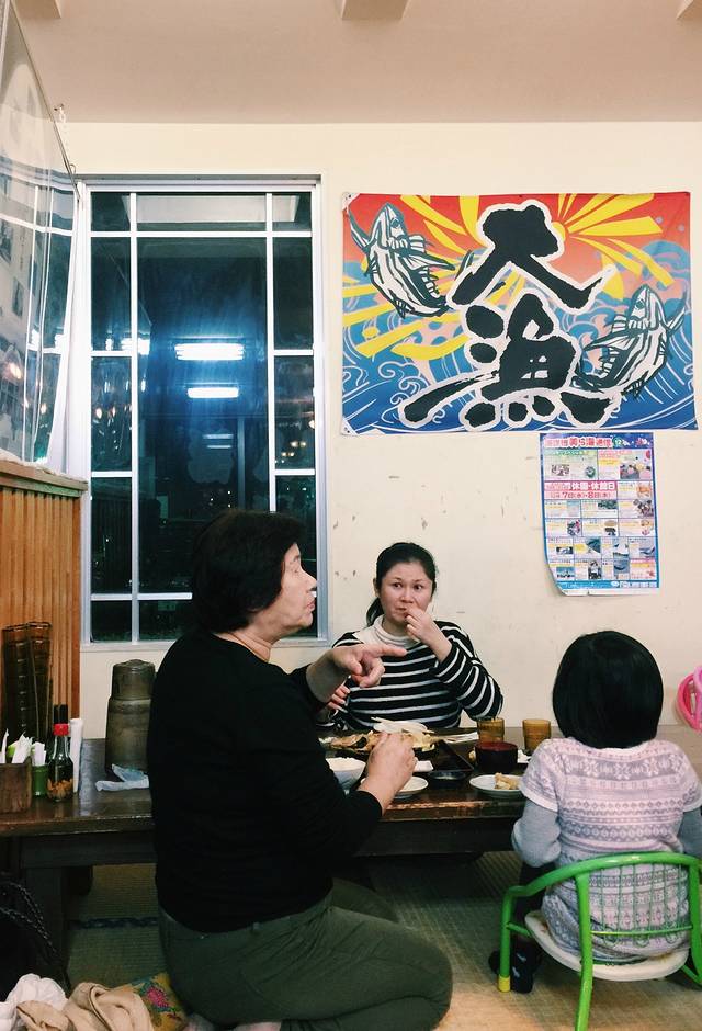 餐馆里好多家庭为单位来度假的,小孩子跑来跑去好热闹,墙上有各种鱼的科普知识,日文和英文