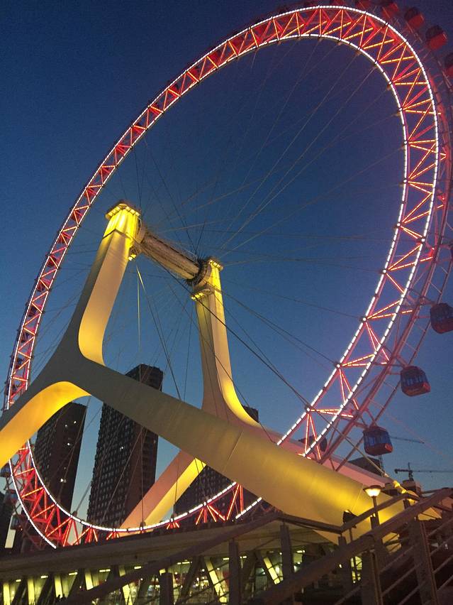 天津之眼是一个位于天津海河永乐桥(原慈海桥)的巨型摩天轮。“天津之眼”是世界上唯一建在桥上的摩天轮。高120米,其直径达到110米,相当于35层楼高,轮外将装挂48个透明座舱,每个座舱的面积将达到12平方米左右,可供8个人同时乘坐,整个摩天轮可以同时实现384人观光。摩天轮依靠电力驱动,匀速旋转一周大约需要30分钟。位于最高处时,可以看到方圆40公里以内的景致。 “天津之眼”地处海河三岔河口黄金地段的核心,是天津传统文化和民俗文化最集中的区域。周边拥有大悲院、古文化街、鼓楼、意式风情区、奥式风情区等天津重要的商贸旅游资源,同时也是海河水上游船观光区的起点。游客到此,一日之间即可以享受休闲、购物、旅游观光等多重欢乐。“天津之眼”摩天轮,是海河开发一桥一景的杰出代表作,是镶嵌在海河上的一颗璀璨明珠。