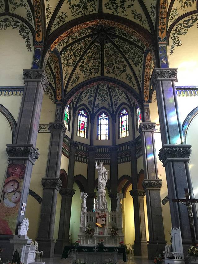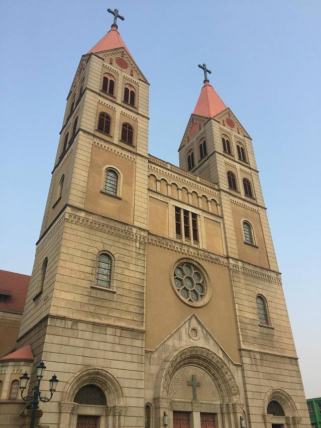 青岛天主教堂始建于1932年,于1934年竣工。占地面积11480平方米,其中建筑面积6301.54平方米。教堂平面呈拉丁“十”字形,正面高30米处设有平台,两侧有两座对称而又高耸的钟塔,高度为60米,塔内上部悬有4个巨大铜钟,钟声悠扬和谐。大门上方有一巨大的玫瑰窗,两侧各耸立起一高4.5米的十字架。该堂结构以钢筋混凝土与花岗石结合而成。屋顶覆盖舌头红瓦,其气势庞大,且又古朴典雅。 教堂装饰系采用意大利文艺复兴时期形式。堂内大厅高18米,宽敞明亮,顶棚悬有七个大吊灯,后方设有祭台,配之穹顶的圣像壁画,堪称庄严美观。可容纳教徒千人,是青岛地区最大的哥特式建筑,也是中国唯一的祝圣教堂,同时也是基督教建筑艺术的杰作。