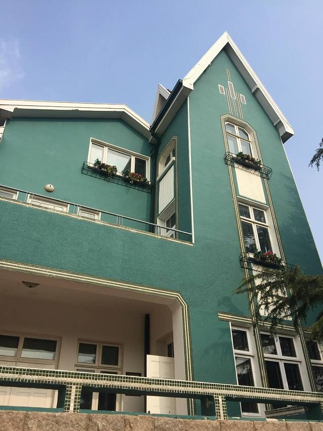 公主楼是一栋极具北欧风格的西式小楼,周身为天蓝色,屋顶为红色大坡度教堂塔楼式屋檐,楼的周围种满了茂密的落叶松,别致的院墙将之独立开来,卓尔不群。沿着砖铺的小径,跨过花园式的庭院进入楼内,宛如走进了安徒生童话中的王宫,这就是被人们称为“公主楼”的最吸引人的地方。