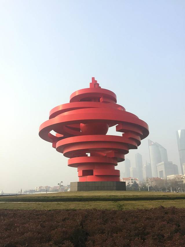 五四广场植物配置以四季常绿的冷季型草坪为主调,以小龙柏、金叶女贞、龟早冬青、紫叶小檗、丰花月季等组图,构成富有现代园林气息的大色块花带,松柏、合欢、耐冬等花木点缀其中,与主体雕塑和海天自然环境有机地融为一体,形成园区蔚为壮丽的景色。 五四广场对面海中有可喷高百米的水中喷泉,整个景区的氛围显得宁静典雅、舒适祥和。这里已成为新世纪青岛的标志性景观之一。